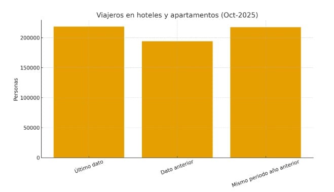 El sector turístico vuelve a liderar la evolución económica de la isla. En octubre llegaron 218.575 viajeros a hoteles y apartamentos, un 12,6% más que el mes anterior. El impulso procede casi en su totalidad del turista internacional, que crece un 18,3%, mientras que el viajero nacional cae un 19,8%.