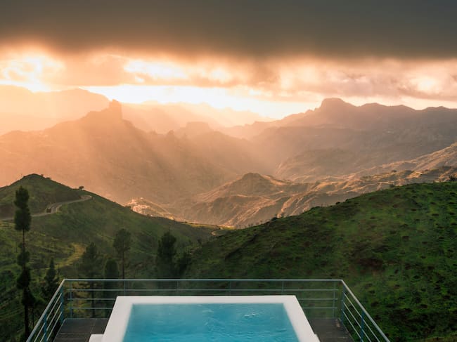 Piscina con vistas al Roque Bentayga al atardecer en una mansión de lujo en Gran Canaria / Andrea Comi