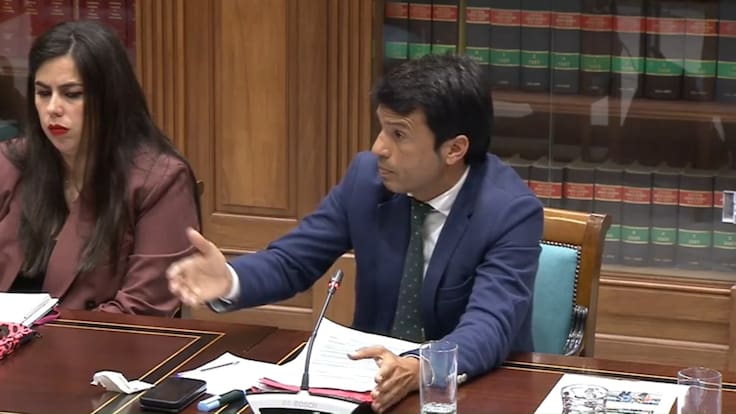 El parlamentario lanzaroteño del PSOE Marcos Bergaz, en la comisión de Obras Públicas, Vivienda y Movilidad del Parlamento de Canarias. / Parcan TV