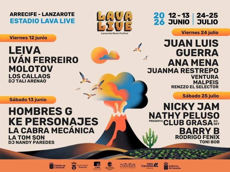 Lava Live Festival 2026, que se perfila como una edición que marcará un antes y un después en la oferta cultural y de eventos de la isla, cuenta con el patrocinio del Cabildo de Lanzarote, a través de SPEL-Turismo Lanzarote, los Centros de Arte, Cultura y Turismo, el Ayuntamiento de Arrecife, Turismo de Canarias, Gobierno de Canarias y Juventud Canarias, entre otras administraciones, y la colaboración de patrocinadores privados, con marcas destacadas como Grupo Renault Juan Toledo, Mahou, Coca-Cola Europacific Partners, Iberia Express, CICAR, HiperDino, Rosa Group Lanzarote, Kokoxili Sushi & Asiático, Chacón, Arehucas, Arrecife Gran Hotel & Spa, Villa Tinguatón, Miterra FM, Salinas de Janubio, Aloe Plus Lanzarote, Viajes Timanfaya, Ahoraluz, Transportes Martac, Open Mall Lanzarote, Grupo Óscar, Iqos y BP.