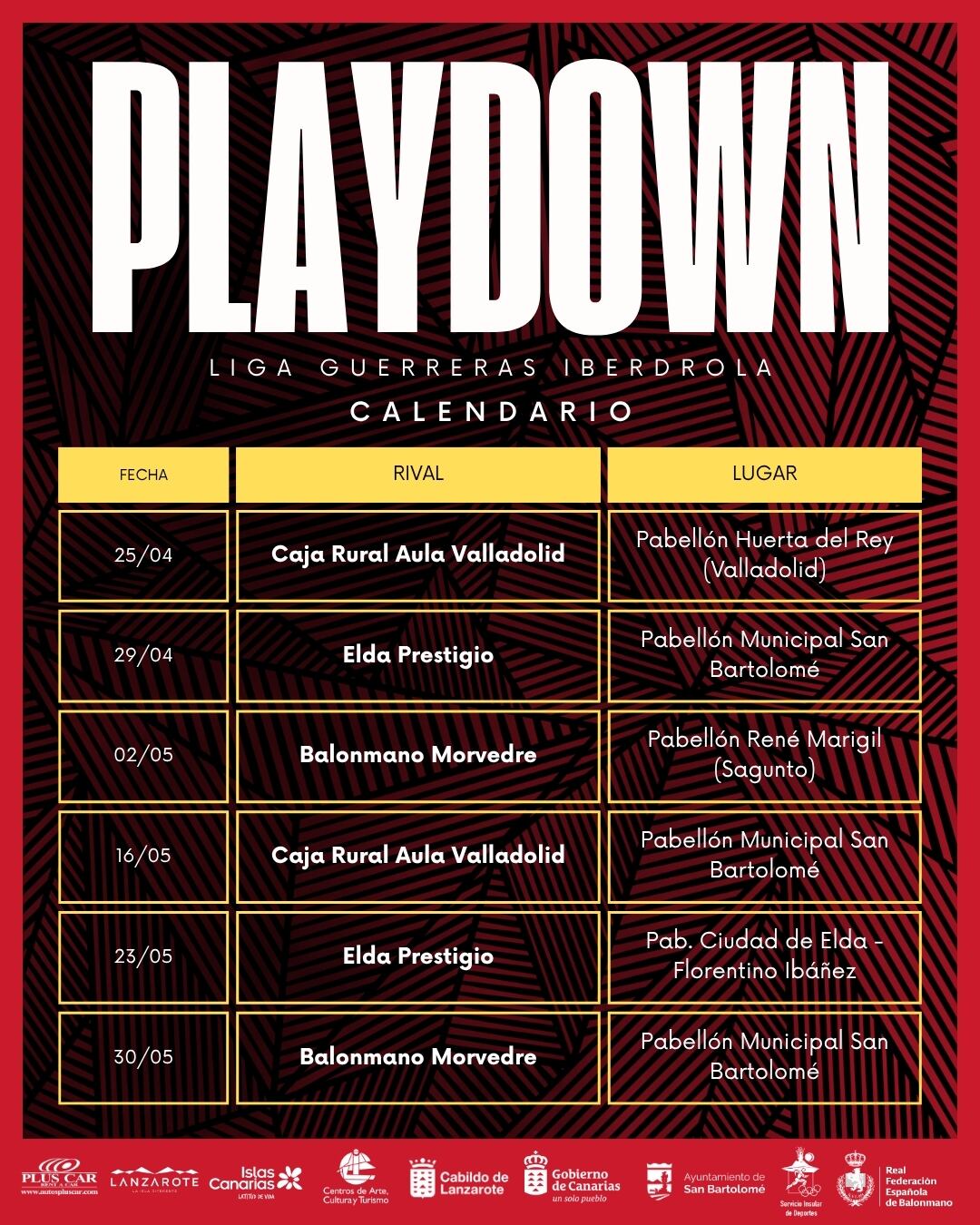 El conjunto lanzaroteño iniciará su camino lejos de casa el sábado 25 de abril con una exigente visita al Caja Rural Aula Valladolid en el Pabellón Huerta del Rey. Apenas cuatro días después, el miércoles 29 de abril, disputará su primer encuentro como local ante el Elda Prestigio en el Pabellón Municipal de San Bartolomé, antes de viajar el 2 de mayo a Sagunto para medirse al Balonmano Morvedre en el Pabellón René Marigil.