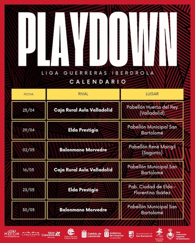 El Zonzamas Plus Car Lanzarote ya conoce el calendario de la fase por la permanencia (play down) de la Liga Guerreras Iberdrola, una liguilla que disputarán los cuatro equipos implicados en la lucha por evitar el descenso: Elda Prestigio, Caja Rural Aula Valladolid, Balonmano Morvedre y el propio conjunto lanzaroteño.