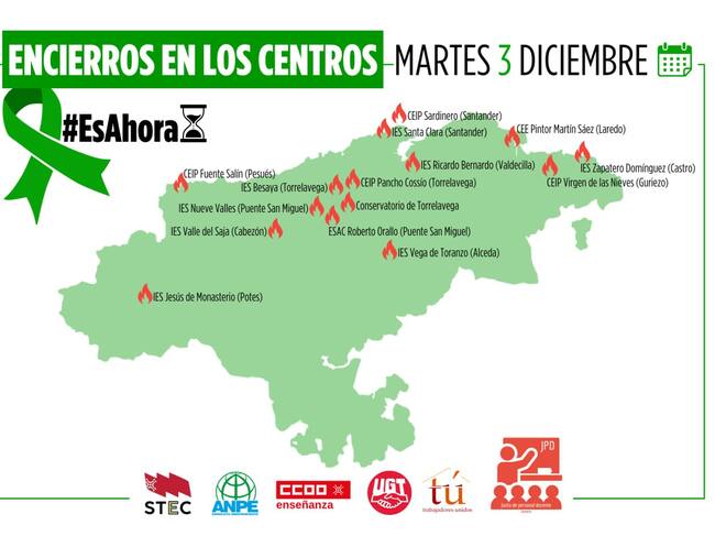 Los centros participantes en el encierro de este martes por la noche son el colegio Manuel Llano y el IES Santa Clara en Santander; el colegio Pancho Cossío, el IES Besaya, el Conservatorio, en Torrelavega; la ESAC Roberto Orallo y el IES Nueve Valles en Puente San Miguel; el IES Vega de Toranzo en Alceda; el IES Ricardo Bernardo en Valdecilla; el colegio Pintor Martín Sáez en Laredo; el IES Zapatero Dominguez en Castro Urdiales; el colegio Virgen de las Nieves de Guriezo; el colegio Fuente Salín de Pesués; el IES Valle del Saja de Cabezón de la Sal; y el IES Jesús de Monasterio de Potes.