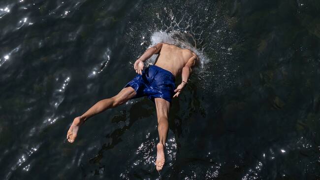 -FOTODELDÍA- CABEZÓN DE LA SAL (CANTABRIA), 11/08/2024.- Una persona se baña en el parque de Santa Lucía este domingo en la localidad cántabra de Cabezón de la Sal, en cuya comunidad la AEMET ha activado el aviso rojo por altas temperaturas. EFE/Pedro Puente Hoyos / Pedro Puente Hoyos (EFE)