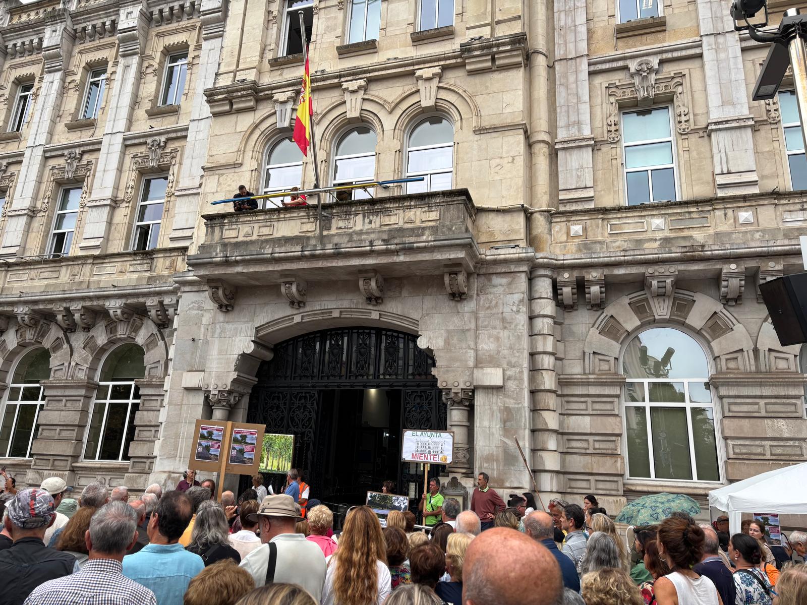 Cientos de personas se han concentrado este lunes al mediodía en la plaza del Ayuntamiento de Santander para reclamar al equipo de Gobierno (PP) que dé marcha atrás y no ejecute el parking de autocaravanas en Mataleñas.