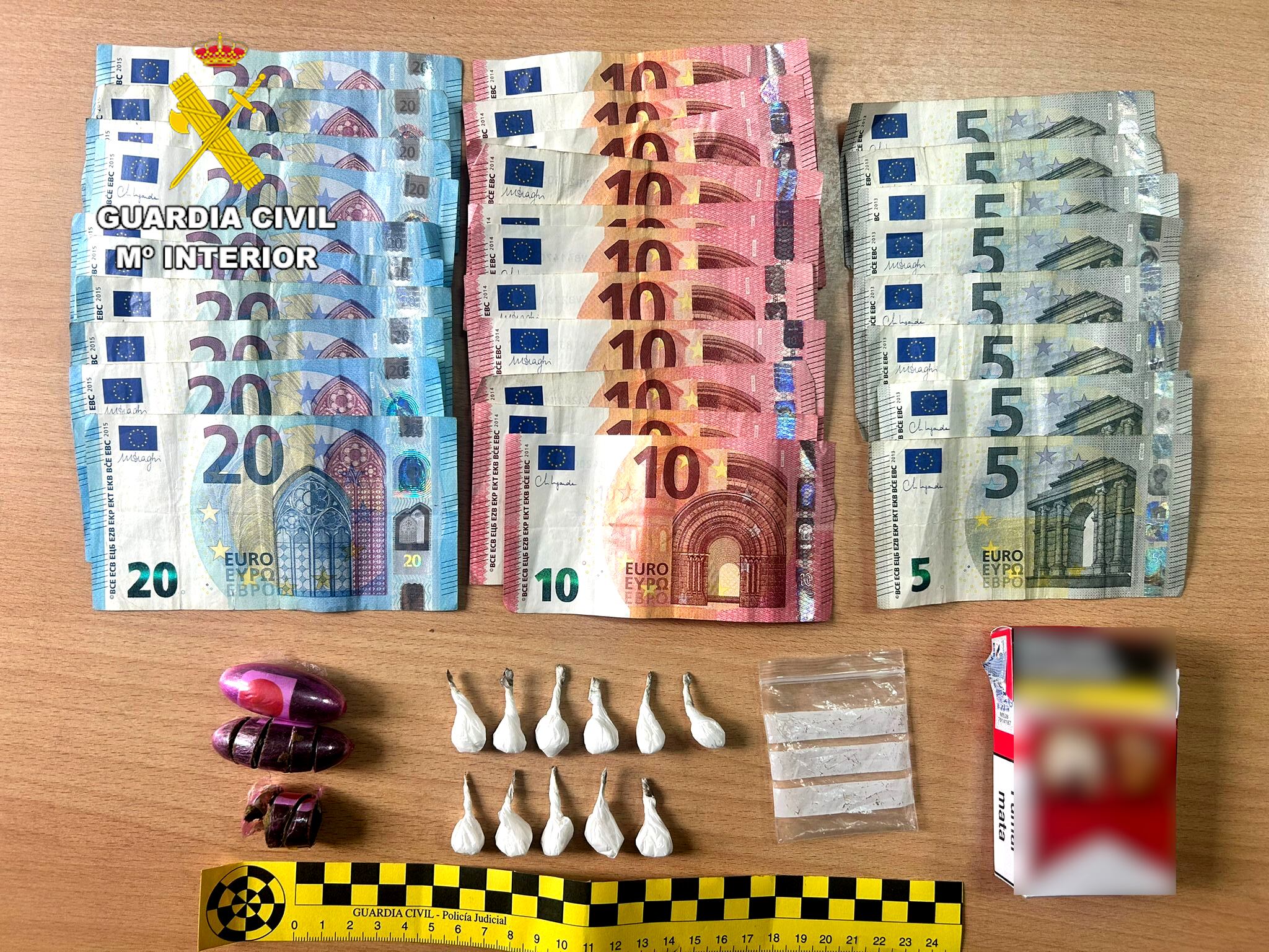 En el interior de la cajetilla se hallaron 11 bolsitas de cocaína y hachís dividido en 8 trozos, todo ello preparado para su distribución al menudeo. Además, al hombre que portaba la cajetilla de tabaco se le intervino dinero fraccionado en billetes de 20, 10 y 5 euros, no descartándose que procediera de otras ventas de estupefacientes.