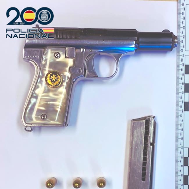 Acto seguido procedieron a su identificación y cacheo superficial, localizando entre sus pertenencias una pistola de calibre 9 milímetros corto, alimentada con seis cartuchos en su cargador, es decir, se encontraba preparada para poder ser utilizada.