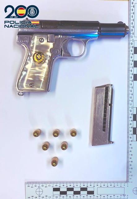 Acto seguido procedieron a su identificación y cacheo superficial, localizando entre sus pertenencias una pistola de calibre 9 milímetros corto, alimentada con seis cartuchos en su cargador, es decir, se encontraba preparada para poder ser utilizada.