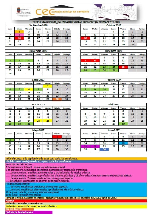 Propuesta que realiza el Consejo Escolar de Cantabria para el calendario del curso 2026-2027.
