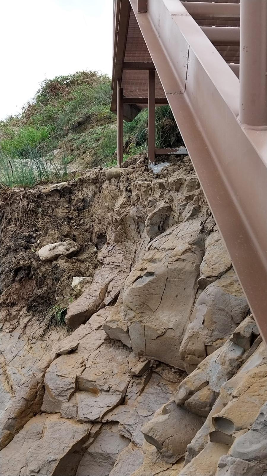 "Esas blandas arcillas soportan los delgados pilares de soporte de la estructura. Unos pilares, varillas metálicas, que, en los primeros días de marzo de 2026, ya estaban escasos centímetros del borde del acantilado después de un invierno de fuertes lluvias y violentos temporales que, literalmente, han diluido las arcillas de Oyambre y robado un metro y medio de arena", ha indicado Salvar Oyambre.