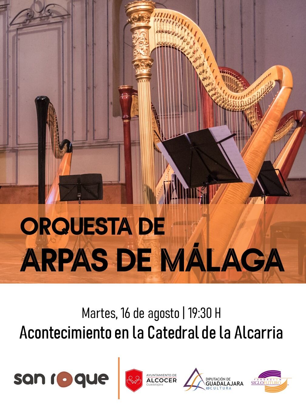 Con motivo de la celebración de la festividad de San Roque, hoy la Catedral de la Alcarria en el municipio de Alcocer va a acoger el concierto de la Orquesta de Arpas de Málaga. Una actuación que va a ser posible gracias a la Fundación Siglo Futuro con su programa "Cultura en ruta" en colaboración con la Diputación provincial, además del ayuntamiento del municipio.