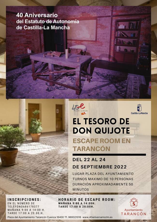 Explicar cómo ha mejorado Castilla-La Mancha durante los 40 años de autonomía. Ese es el objetivo del Escape Room que está abierto al público en la plaza del Ayuntamiento de Tarancón desde hoy jueves hasta el sábado. Se espera que unos 2.000 escapistas participen durante estos tres días en esta experiencia, en la que descubrirán, de la mano de Don Quijote, cual es el verdadero tesoro de nuestra región, tal y como ha explicado Cesar Alcázar, gerente de Teatro Narea, que da vida a esta experiencia.