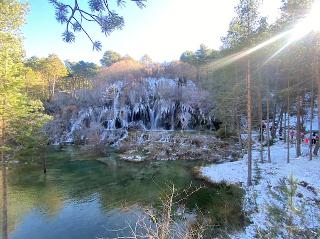 Con las previsiones de heladas que pueden dejar hasta -6º en este punto en la madrugada de este 24 de enero, es muy probable que toda la cascada se congele creando entonces otra de las estampas más típicas del Nacimiento del río Cuervo, que se repite cada invierno, y que solo aguanta unos días.