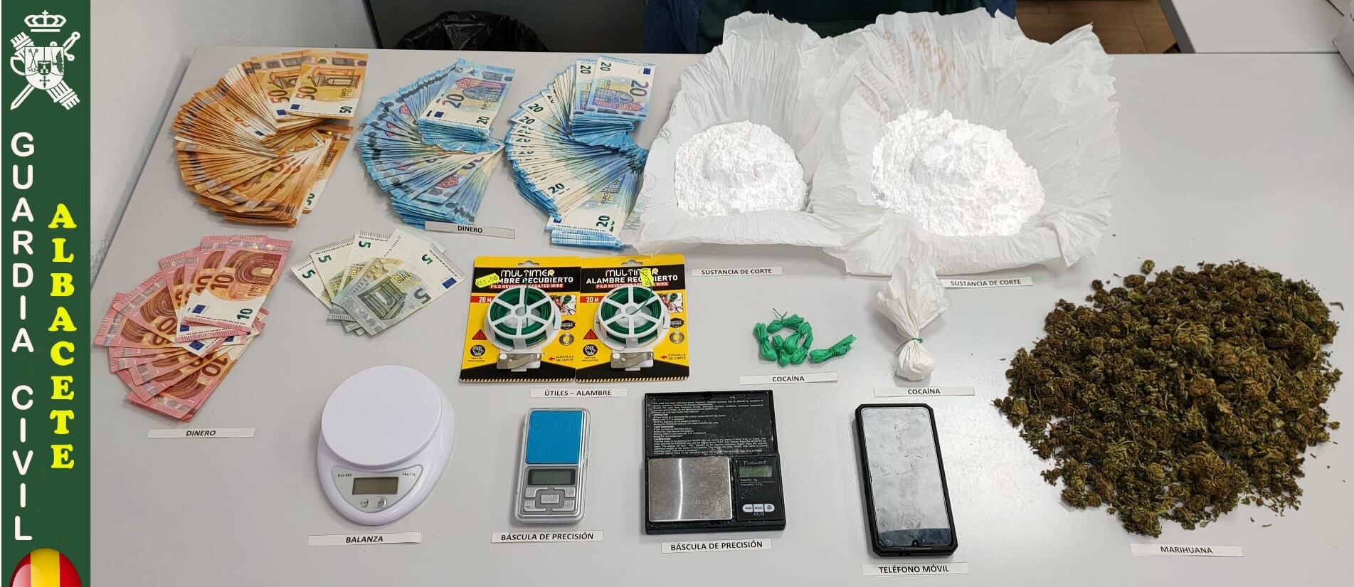 El punto de venta en la localidad de Villamalea no solo se limitaba al citado municipio, sino que la droga era distribuida en localidades próximas, retirando del mercado ilícito unas 725 dosis de cocaína y marihuana.