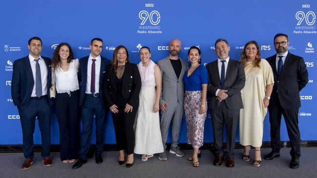 El delegado provincial de Agricultura, Ganadería y Desarrollo Rural, Ramón Sáez, el delegado provincial de Economía, Empresas y Empleo, Nicolás Merino, el director regional de Cadena SER, Félix Amaya, el diputado nacional del PSOE, Emilio Sáez, la concejal del PSOE, Marisa Sánchez, el director de la red de emisoras de Cadena SER, José Antonio Cabornero, la directora de Radio Albacete, Justina Gómez, la consejera Portavoz del Gobierno regional, Esther Padilla, el presidente de la Diputación provincial, Santiago Cabañero, la diputada regional del PSOE, Josefina Navarrete, la directora general de comunicación de la Consejería Portavoz, Sara Burgos, el delegado de la Junta en Albacete, Pedro Antonio Ruíz Santos, y el subdelegado del Gobierno en Albacete, Miguel Juan Espinosa. / Juan Carlos Navarro