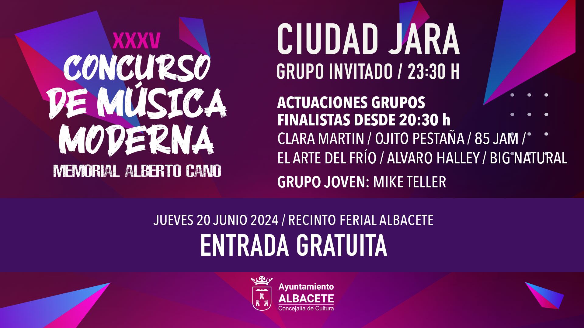 - El jueves, día 20 de junio, tendrá lugar la gala final del concurso de música moderna Memorial Alberto Cano, enmarcada este año en Antorchas Festival, con Ciudad Jara como banda invitada y la actuación de la DJ Jelly Juice. La concejala ha anunciado los finalistas que competirán en la gran final el próximo jueves 20 de junio en el Recinto Ferial, dentro de la programación del Festival Antorchas, siendo estos: Clara Martin, Ojito Pestaña, 85 Jam, El Arte del Frío, Álvaro Halley y Big Natural. Además, el Premio Joven será otorgado a Mike Teller, quien también realizará una breve actuación durante la final.