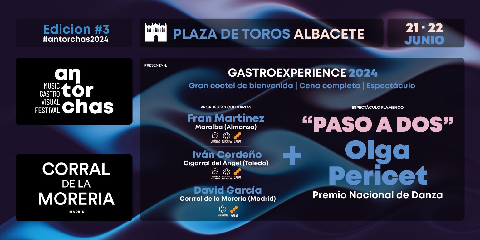 - El Espacio 2 (Gastro-Experience) se desarrollará en la Plaza de Toros y tendrá dos shows con espectáculo y cena para 150 personas durante las noches del 21 y 22 de junio en el propio ruedo. Los asistentes disfrutarán de seis propuestas diseñadas por los chefs Fran Martínez, de Maralba, en Almansa, con dos estrellas Michelin y tres soles Repsol; Iván Cerdeño, del Cigarral del Ángel, en Toledo, con dos estrellas Michelin y tres soles Repsol; y David García, del Corral de la Morería, el único tablao con una estrella Michelin y tres soles Repsol, con el espectáculo “Paso a dos” de Olga Pericet, Premio Nacional de Danza. Los días 20 y 23 se podrá ofrecer a la Asociación de Hostelería el espacio para desarrollar un espectáculo y cena, elaborada por cocineros de la ciudad.