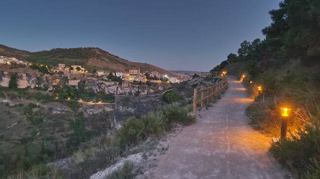 Las altas temperaturas no tienen por qué impedir conocer la riqueza natural y patrimonial de Cuenca. La ciudad tiene abiertos ya los senderos de las Hoces, que se han iluminado para que puedan ser utilizados por las noches, cuando el calor ha remitido y los termómetros invitan a pasear.