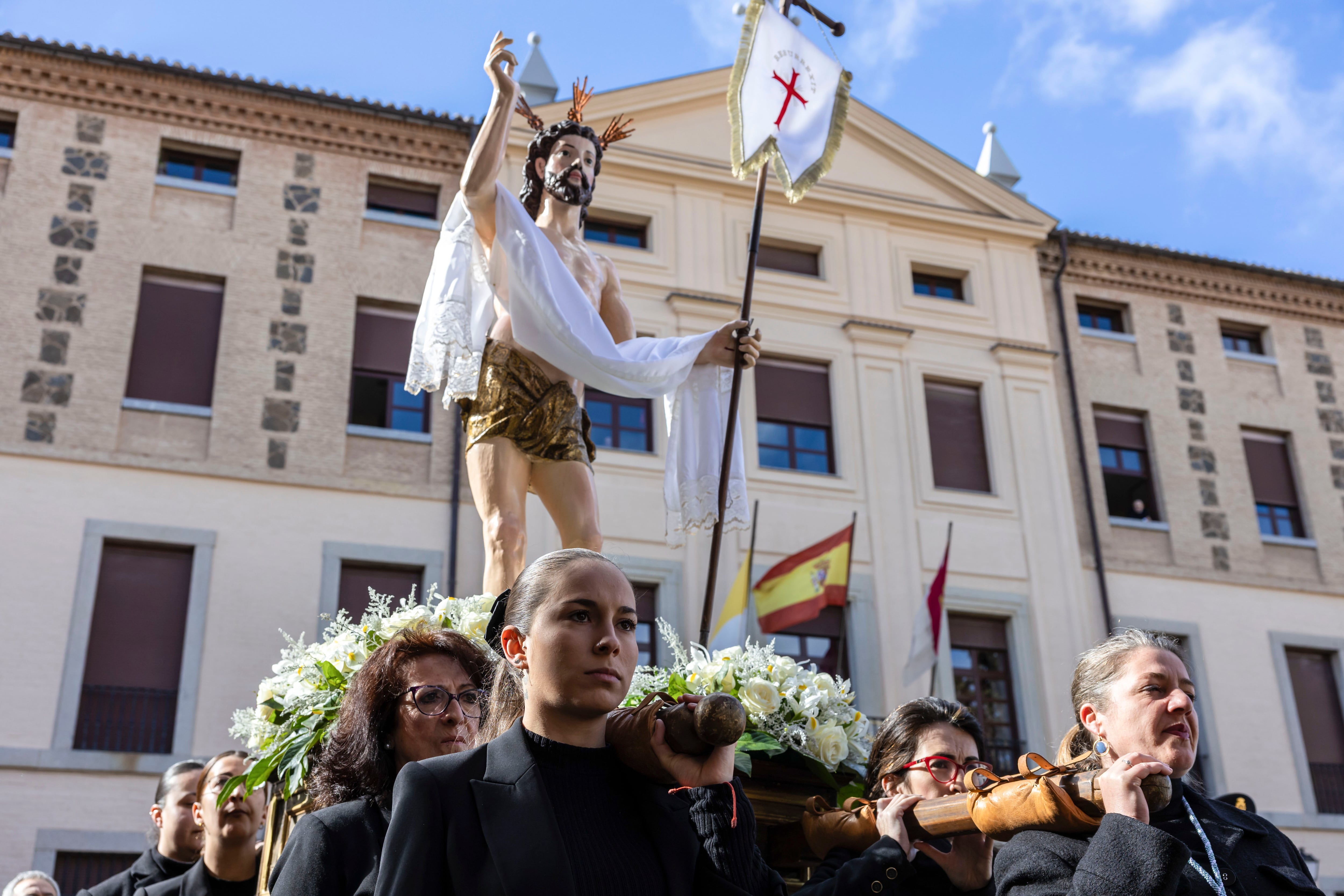 TOLEDO, 20/04/2025.- El Cristo Resucitado y Nuestra Señora de la Alegría se encuentran en las últimas procesiones de la Semana Santa toledana Plaza del Ayuntamiento. EFE/Ángeles Visdómine / Ángeles Visdómine