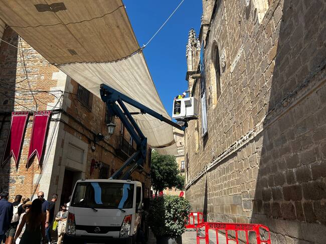 Imagen de la colocación de los toldos en el Corpus de Toledo / Ariadna Burgos