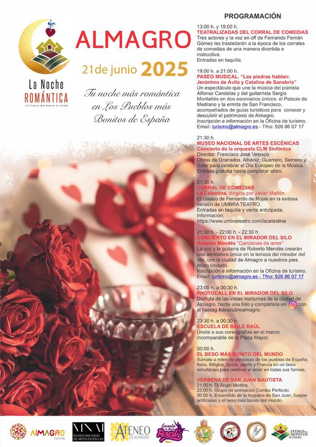 Será una completa jornada con la que se da la bienvenida al verano y a medianoche, Almagro se unirá a miles de personas en todo el mundo en “El Beso Más Bonito del Mundo”, un momento único que conectará a enamorados de España, Italia, Japón, Bélgica, Francia y otros países.