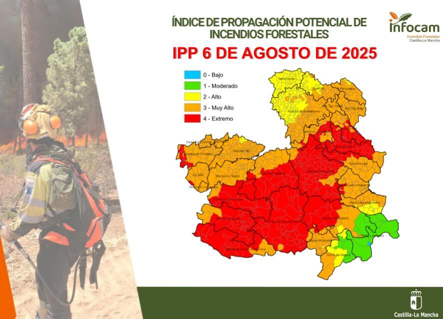 La Mancha conquense y una parte de la comarca de La Manchuela, en la provincia de Cuenca, afronta este miércoles 6 de agosto un riesgo extremo de propagación de incendios forestales, según el Índice de Propagación Potencial (IPP) publicado por el plan INFOCAM de Castilla-La Mancha. Sisante, El Picazo, Casasimarro, Pozorrubielos de la Mancha o Casas de Benítez, entre otros, se encuentran en nivel 4.