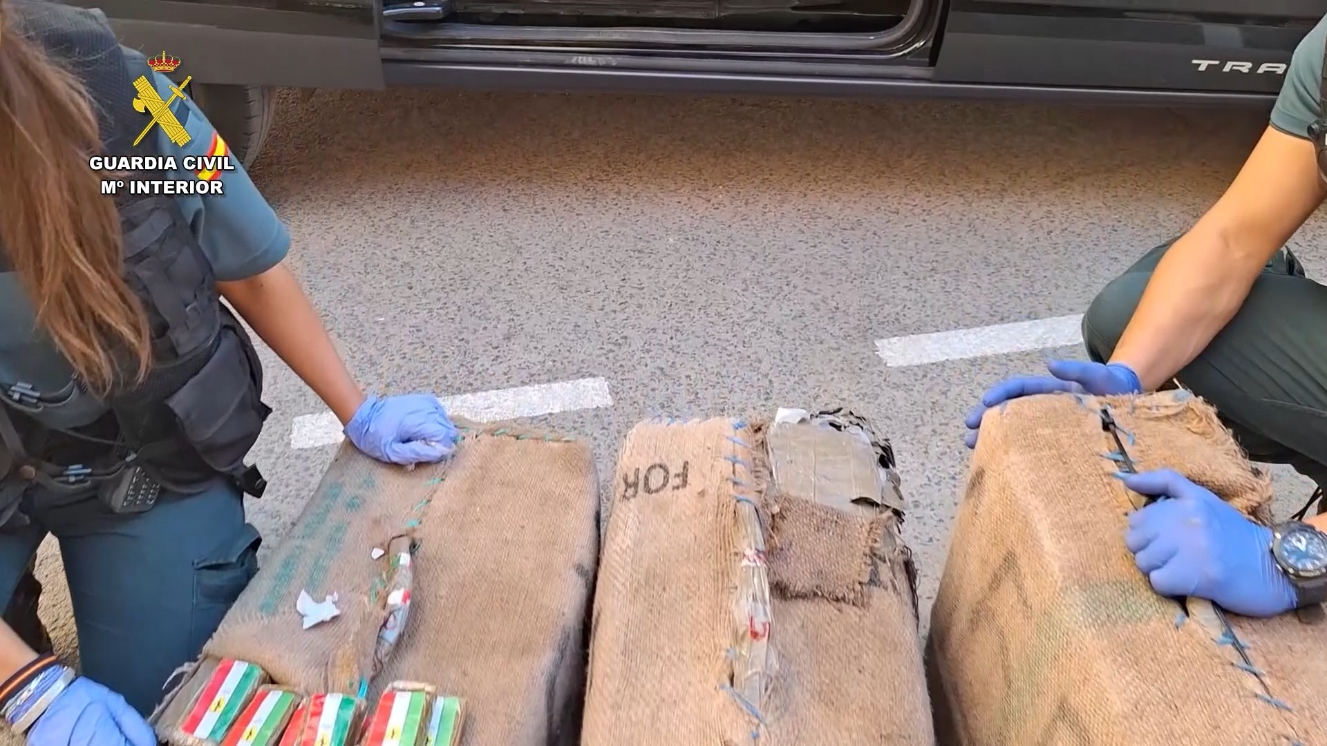 Una vez identificado su conductor y único ocupante, se realizaba una inspección del vehículo, localizando en la parte trasera y en el maletero siete fardos de arpillera que contenían una sustancia de color marrón con un olor característico que, tras ser analizada con un narcotest, resultó ser hachís.