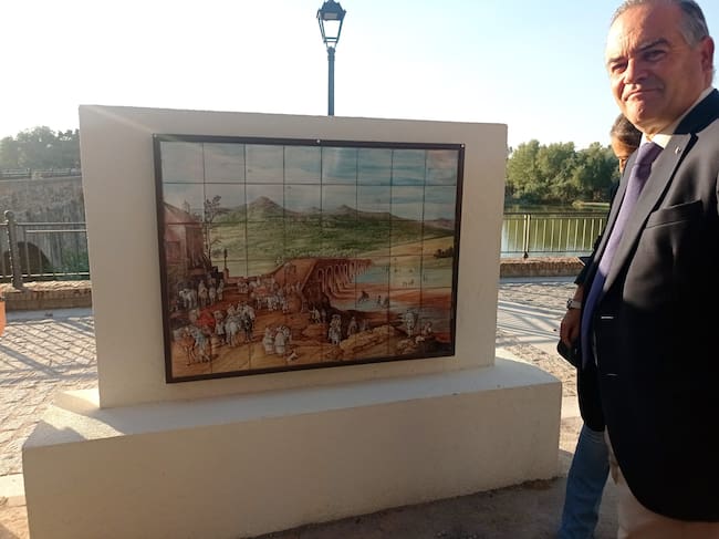 El alcalde, José Julián Gregorio, junto al nuevo mural cerámico del Puente Viejo de Talavera / Carlos Sánchez Jiménez