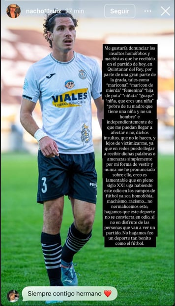 Pero el resultado quedó eclipsado por un episodio lamentable. El jugador conquense Nacho Ruiz denunció en sus redes sociales haber recibido insultos homófobos y machistas por parte de un sector de la grada de San Marcos. Entre ellos, expresó que escuchó frases como “maricona”, “maricón de mierda”, “niñata” y el ataque dirigido a su familia: “pobre de tu madre que tiene una niña y no un hombre”.
