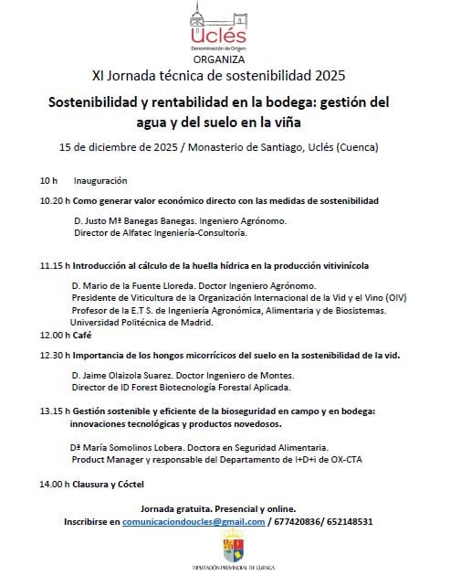 La sostenibilidad ya no es una tendencia, sino un requisito para la supervivencia del sector vitivinícola. Con esa convicción, la Denominación de Origen Uclés celebrará el próximo 15 de diciembre su XI Jornada Técnica de Sostenibilidad, una cita que tendrá lugar en el monasterio de Santiago de Uclés y que reunirá a investigadores, técnicos y profesionales del vino para analizar los desafíos más urgentes del campo y la bodega.