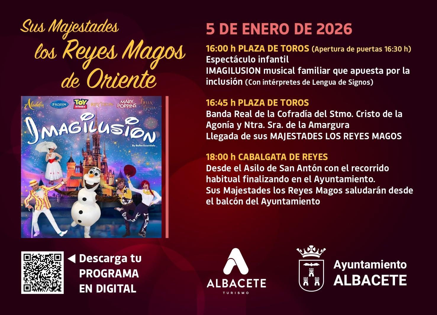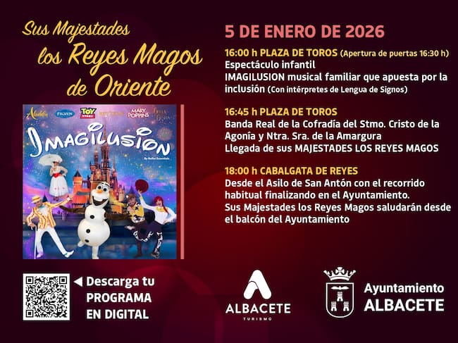 - A las 18:00 horas, está prevista la salida de la cabalgata de Reyes desde la puerta del Asilo San Antón, en su punto habitual, para iniciar su recorrido por las calles Avenida de España, Tesifonte Gallego, Marqués de Molins, Plaza del Altozano, Martínez Villena y su llegada al Ayuntamiento donde los Reyes Magos saludarán desde el balcón a los albaceteños que se hayan dado cita en la Plaza de la Catedral.