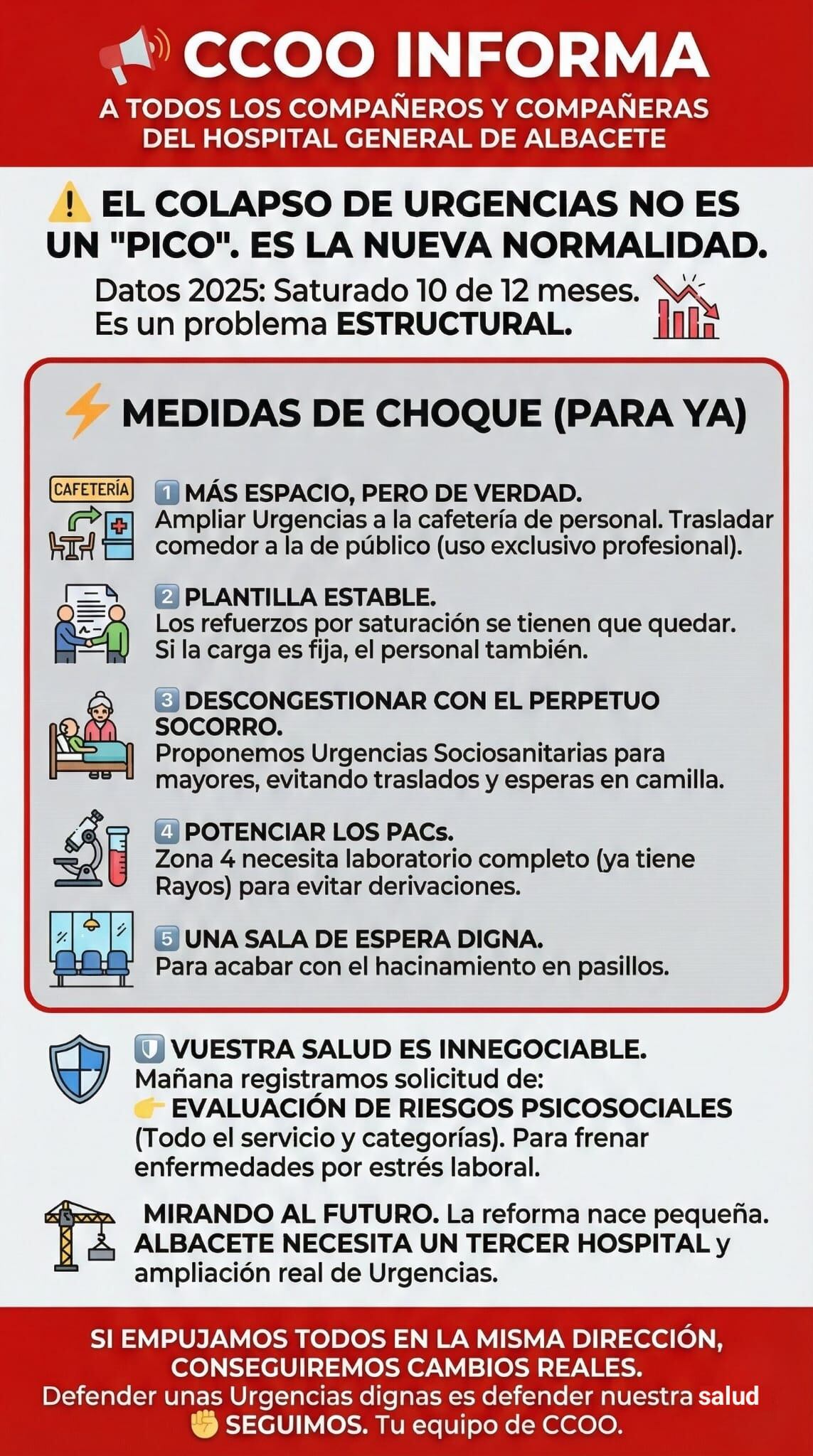Desde CCOO creemos que parchear no sirve. Albacete necesita un tercer hospital y una ampliación real de Urgencias (quizás usando la zona de la rampa actual). Seguir estirando el chicle del Hospital General ya no da más de sí.