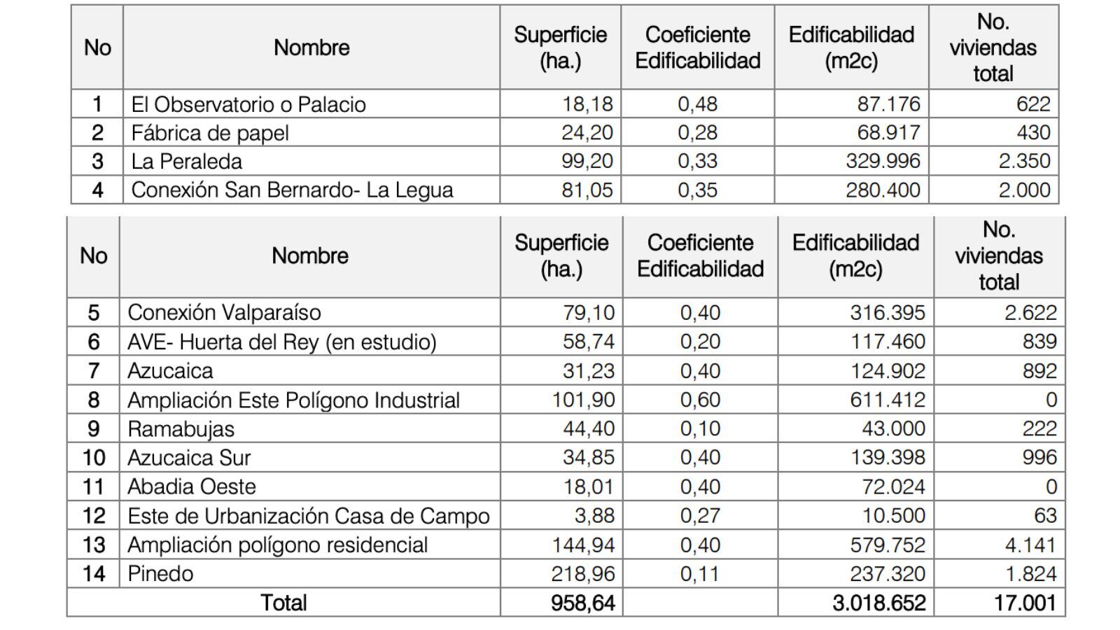 Unos números recogidos en la memoria que figura en el sistema NEVIA (propiedad de la Junta), plataforma electrónica en la que se publican los proyectos o planes que precisan de estudio de impacto medioambiental. Datos que difieren de la memoria del propio Ayuntamiento de Toledo, en donde se reduce el número de viviendas a 17.001, tal y como se refleja en esta misma información.