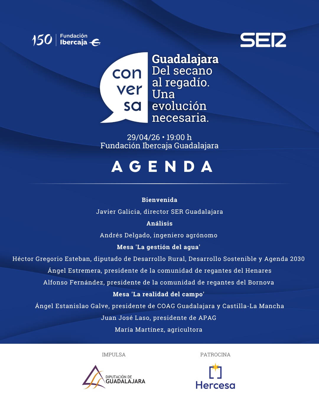 La tercera edición de Conversa Guadalajara reunirá en la sede de Fundación Ibercaja a cuatro sectores protagonistas del debate: administración pública, agricultores, ingenieros y regantes.