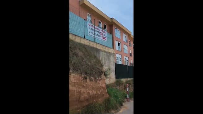 Los vecinos han colgado un cartel en la valla de su patio alertando del peligro de derrumbe y denunciando la desidia del Ayuntamiento de Guadalajara.
