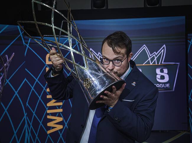 Fran Hernández besando uno de los trofeos de la Basketball Champions League conseguidos por el Hereda San Pablo. / Foto: BCL