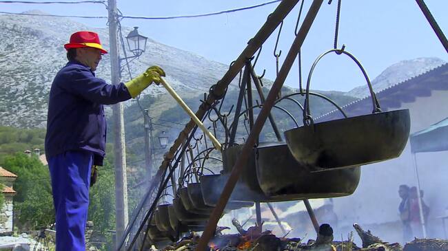 Carne de cordero, ajo, pimienta, cayena, laurel, vino blanco y mucho calor… Así se hacía el guiso del pastor tradicionalmente y así se sigue haciendo 50 años después en la fiesta de la montaña palentina. Sebastián madruga para preparar en la calle 26 ollas de caldereta de cordero. Por dos euros adquieren una cazuelita de barro y turistas llegados de toda España acuden a comer gratis y disfrutar la naturaleza.