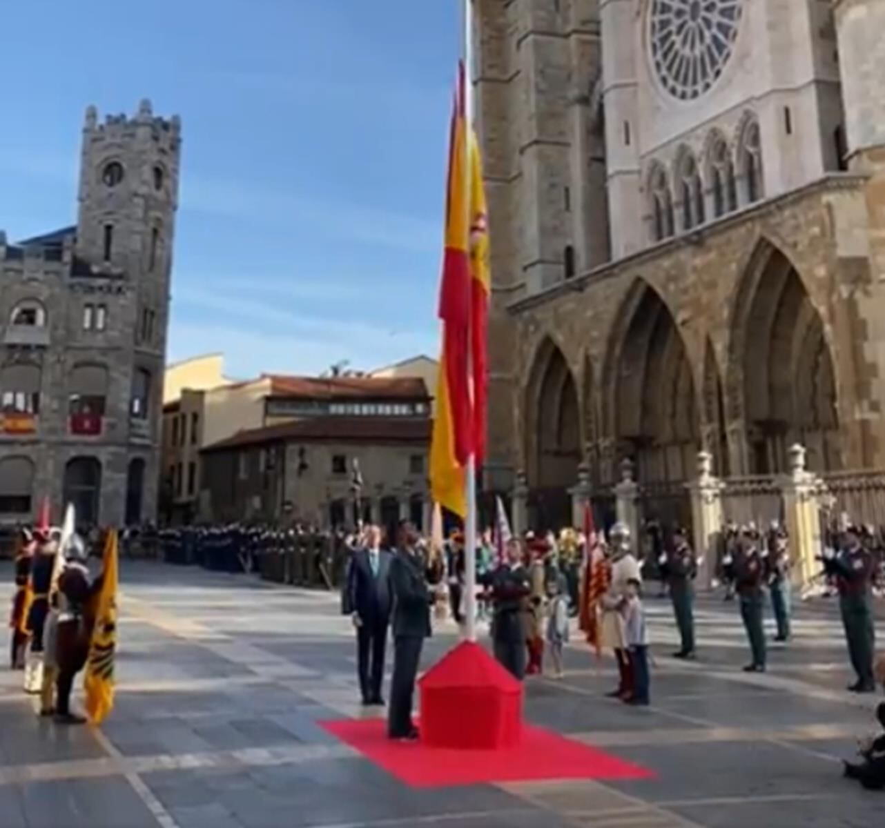 Ni 24 horas ha permanecido izada la bandera de España que este lunes, con motivo del comienzo de los actos de la Guardia Civil en León, quedó instalada en la Plaza de Regla de León, a los pies de la Catedral. La policía local ha tenido esta madrugada que actuar después de recibir el aviso de que un joven estaba arriando la enseña al filo de las 3.00 de la mañana. Posteriormente, se dirigió con ella a la parada de taxis ubicada en Ramón y Cajal y se fue en uno de estos vehículos a su domicilio en Sariegos. El joven ha sido ya identificado y la bandera recuperada.