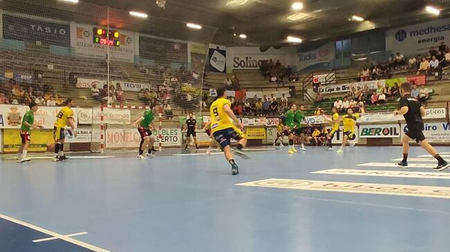 Jugada del Tubos Aranda para intentar establecer la máxima renta del partido antes del descanso. Tiempo muerto de Mariano Ortega para preparar una jugada que resolvería los primeros 30 minutos en el 40X20 ribereño con 16-14 tras el fallo de siete metros de Berbel.