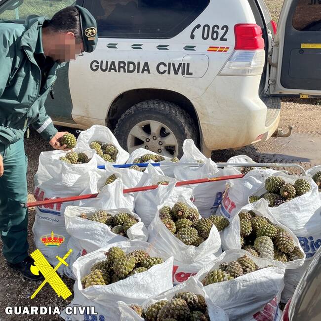 La Guardia Civil ha localizado e intervenido 800 kilogramos de piñas piñoneras, recogidas y transportadas ilegalmente, por lo que se han levantado dos actas de denuncia al infractor, que se apropió de estos frutos silvestres fuera de época hábil y que carecía de autorización para su transporte.