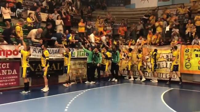 La plantilla del Tubos Aranda celebra la última victoria en el Príncipe ante Zamora junto a su afición