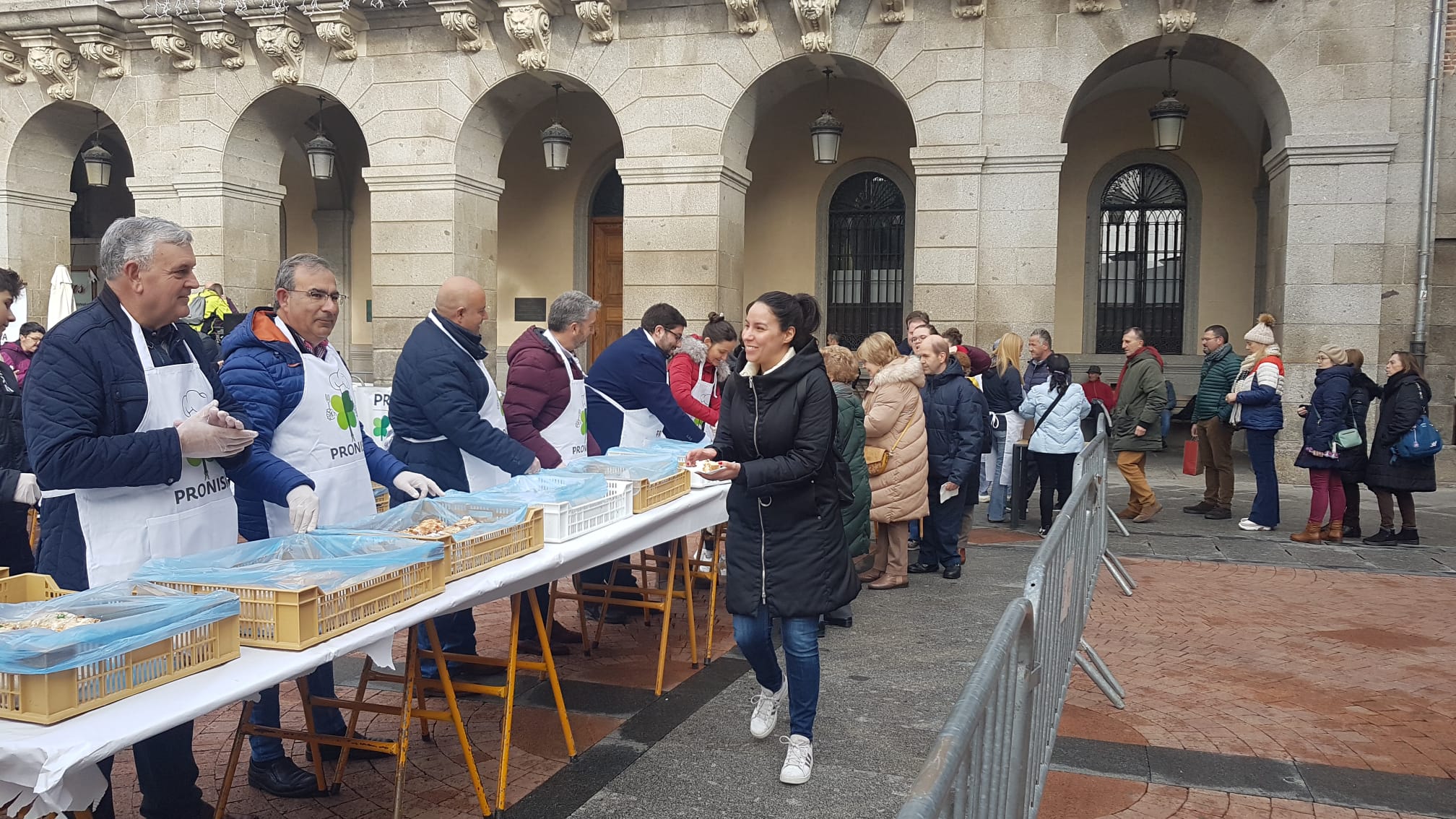 El Ayuntamiento de Ávila colabora con esta entidad en el desarrollo de iniciativas como la I Semana Internacional contra la violencia de género, que se realizó el pasado mes de noviembre, o este roscón solidario que ido acompañado de otras tantas raciones de chocolate. De esta manera, abulenses y visitantes han hecho cola desde las 11.30 horas para degustar algunas de estas raciones, a cambio de la aportación económica que han considerado, en función de sus posibilidades. Aunque estaba previsto que esta acción se prolongara hasta las 13.30 horas, las existencias se han agotado media hora antes de lo previsto, ya que la última porción se ha entregado poco antes de las 13.00 horas, si bien todavía quedaba chocolate, repartido por la entidad Pronisa Plena Inclusión.