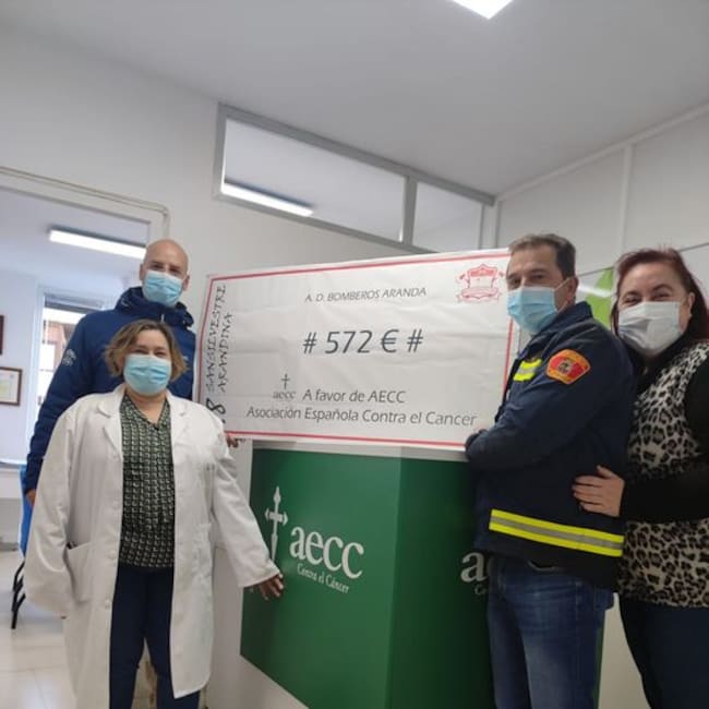 La Asociación Española Contra el Cáncer recibe una donación de 572 euros de la organización de la San Silvestre arandina. La Asociación Deportiva Bomberos de Aranda de Duero entregaba este martes a los representantes de este colectivo social en su propia sede un cheque simbólico con esta cifra, que corresponde a multiplicar un euro por cada uno de los niños y niñas que completaron esta carrera popular de Nochevieja.