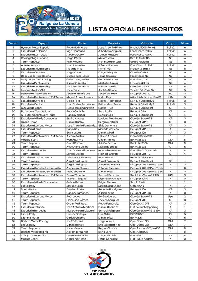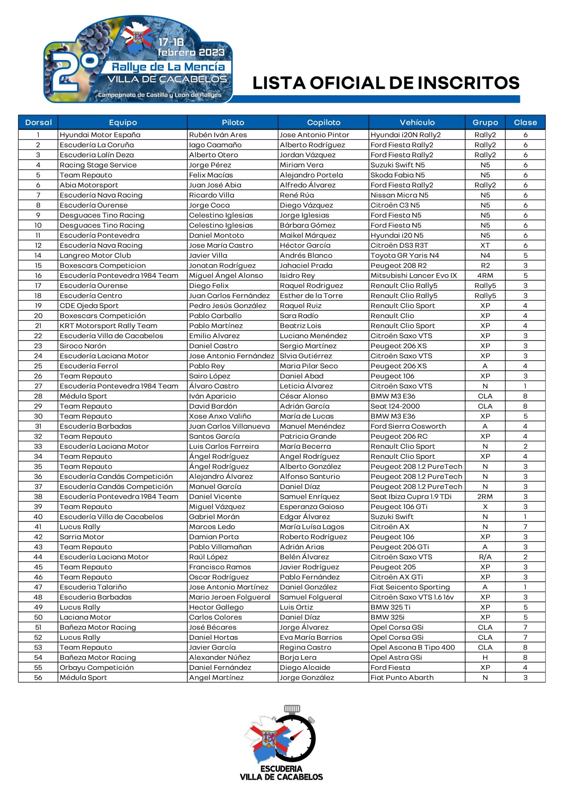 En cuanto a de la prueba destaca un total de 55 equipos que están inscritos en la prueba donde figuran pilotos importantes como Iván Ares (doble campeón de España de rallyes), Iago Caamaño (subcampeón gallego) o Alberto Otero, todos ellos con monturas Rally2. Entre los numerosos N5 inscritos destacan dos pilotos que ya saben lo que es ganar en Cacabelos, como Félix Macías y Jorge Pérez, que darán mucha batalla en los puestos de honor. Además, varios equipos saldrán a esta prueba con la intención de probar sus vehículos de cara a diversas copas, contando con varios Clío Rally5 del Clío Trophy Spain y varios Peugeot 208 del Volan FAPA.