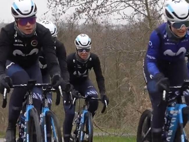 Sara Martín (centro) junto a sus compañeras de Movistar Team en el reconocimiento del recorrido de la prueba holandesa