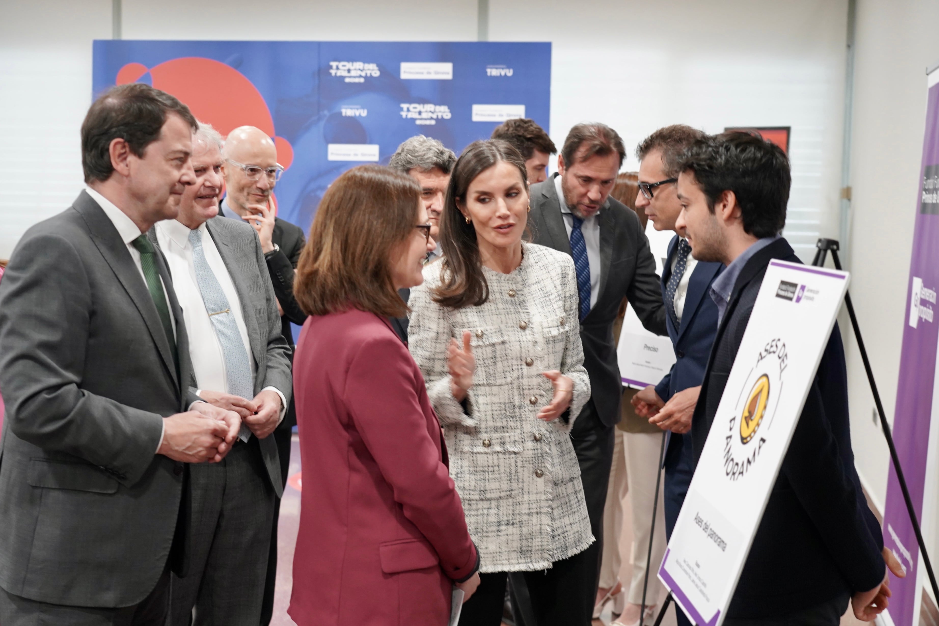 Antes de entrar al auditorio de la Feria de Valladolid, la reina también pudo hablar y conocer de cerca cada una de las iniciativas presentadas por jóvenes en el Programa ‘Generación Propósito’. Los proyectos finales corrieron a cargo de Miguel Garrido con su proyecto ‘Humánime Humanización’, un movimiento cuyo propósito es la humanización del Sistema Sanitario Español; el de Clara Ortega, ‘Ni una butaca vacía’, que busca acercar la cultura a las personas mayores en situación vulnerable; el de Álex Cánovas, ‘Ases del panorama’, que persigue divulgar y reforzar la educación financiera entre los jóvenes, y el de María Jesús Marín, ‘Preciso’, que es una herramienta que mejora la salud de las personas, su capacidad de trabajo y el clima psicosocial de la empresa a través de una aplicación gamificada. La Fundación Princesa de Girona aseguró que estas iniciativas ya impactan de forma positiva en la sociedad tras el paso del Campus. Letizia escuchó atentamente durante unos minutos las explicaciones de cada uno de los finalistas y, posteriormente, apuntó ante los medios de comunicación que había sido “muy interesante”.
