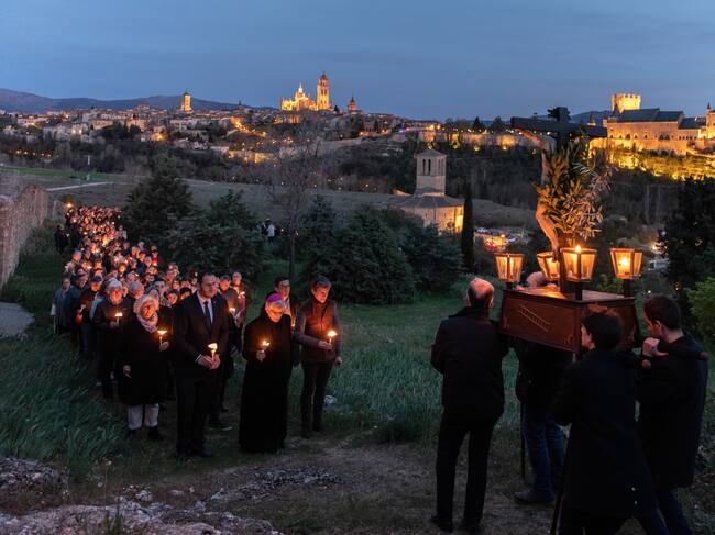 La visión de la ciudad al fondo mientras anochece y el protagonismo de la Catedral y el Alcázar confieren al vía crucis de Huerta de los Padres Carmelitas un carácter único