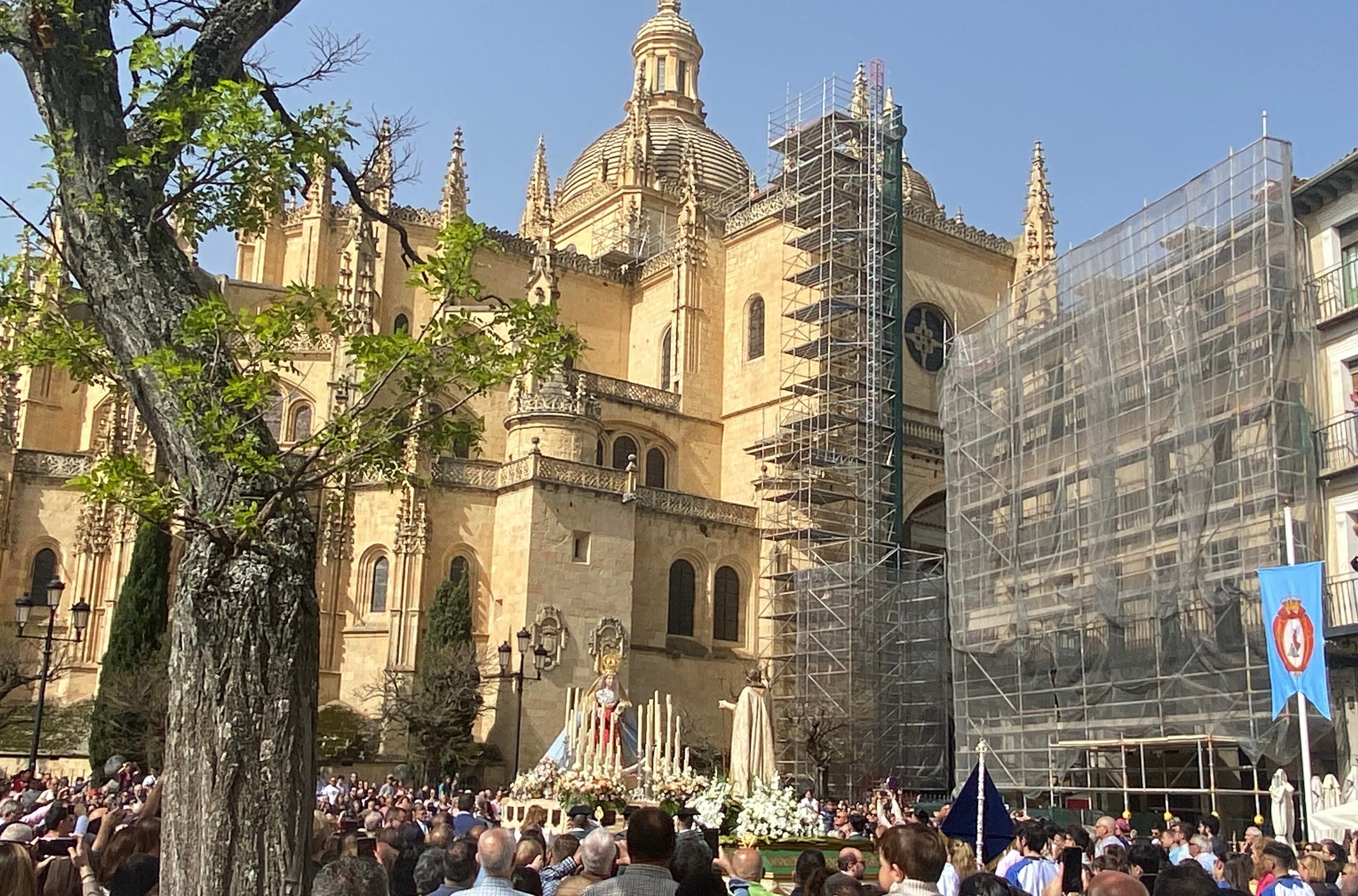 Los pasos de Nuestra Señora del Rocío y Cristo Resucitado se han encontrado, frente a frente, en la Plaza Mayor, a los pies de la Catedral.