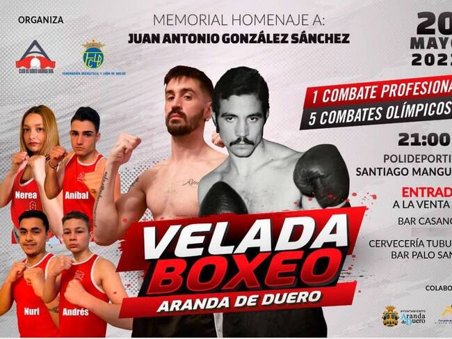 La velada organizada por el propio Aranda Box y la Federación Castellano y Leonesa de Boxeo contará con la colaboración de a Concejalía de Deportes del Ayuntamiento de Aranda. Las entradas se pueden adquirir en Bar Casanova, Cervecería Tubular y Bar Palo Santo.