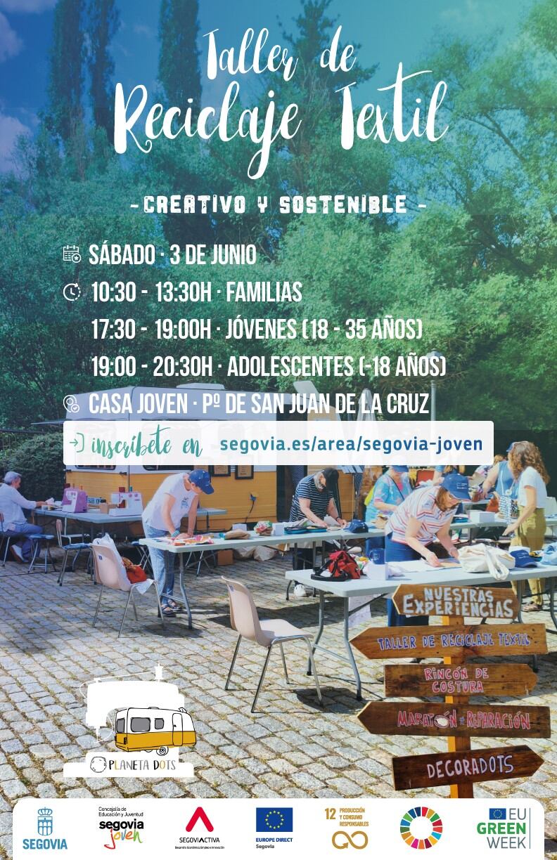 El Ayuntamiento de Segovia, a través de la Concejalía de Juventud y del centro EUROPE DIRECT Segovia, organiza un Taller de Reciclaje Textil Creativo y Sostenible para celebrar la Semana Verde Europea, donde la economía circular es uno de los temas prioritarios para la presente edición, y el Día Mundial del Medio Ambiente.